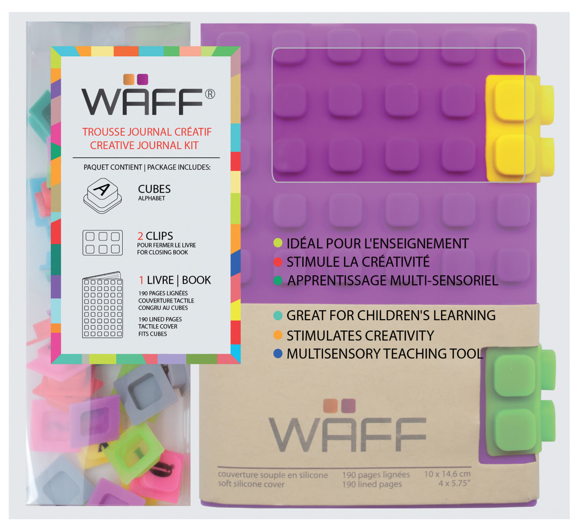 Creative journal. Ideal for encouraging creativity. Soft cover that can be personalized with WAFF patterns and letter cubes. Ideal for teaching and multi-sensory learning