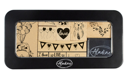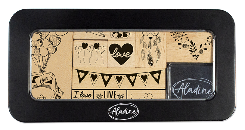 Magnifique coffret de tampons en bois avec un encreur noir. Thème Love, idéal pour personnaliser vos faireparts ou pour offrir à vos proches. 11 tampons en caoutchouc très détaillés, montés sur bois et facilement lavable à l’eau.