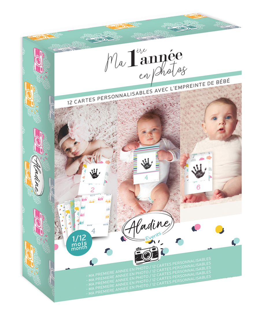 Coffret comprenant 10 cartes décorées et personnalisables avec les empreintes des mains et pieds du bébé et 1 encreur répondant aux normes des enfants de moins de 3 ans. Prenez de belles photos souvenirs pour vous remémorer sa première année.