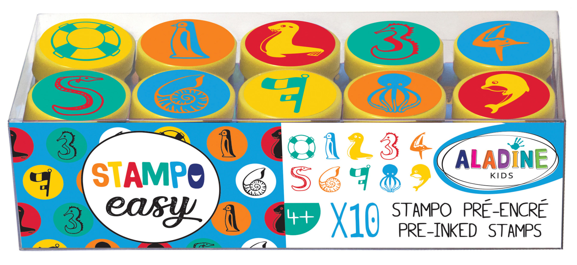 Faites découvrir les chiffres aux tout-petits avec ces tampons pré-encrés à l'ambiance marine ! 10 Tampons pré-encrés colorés très faciles à utiliser dès l'âge de 4 ans.