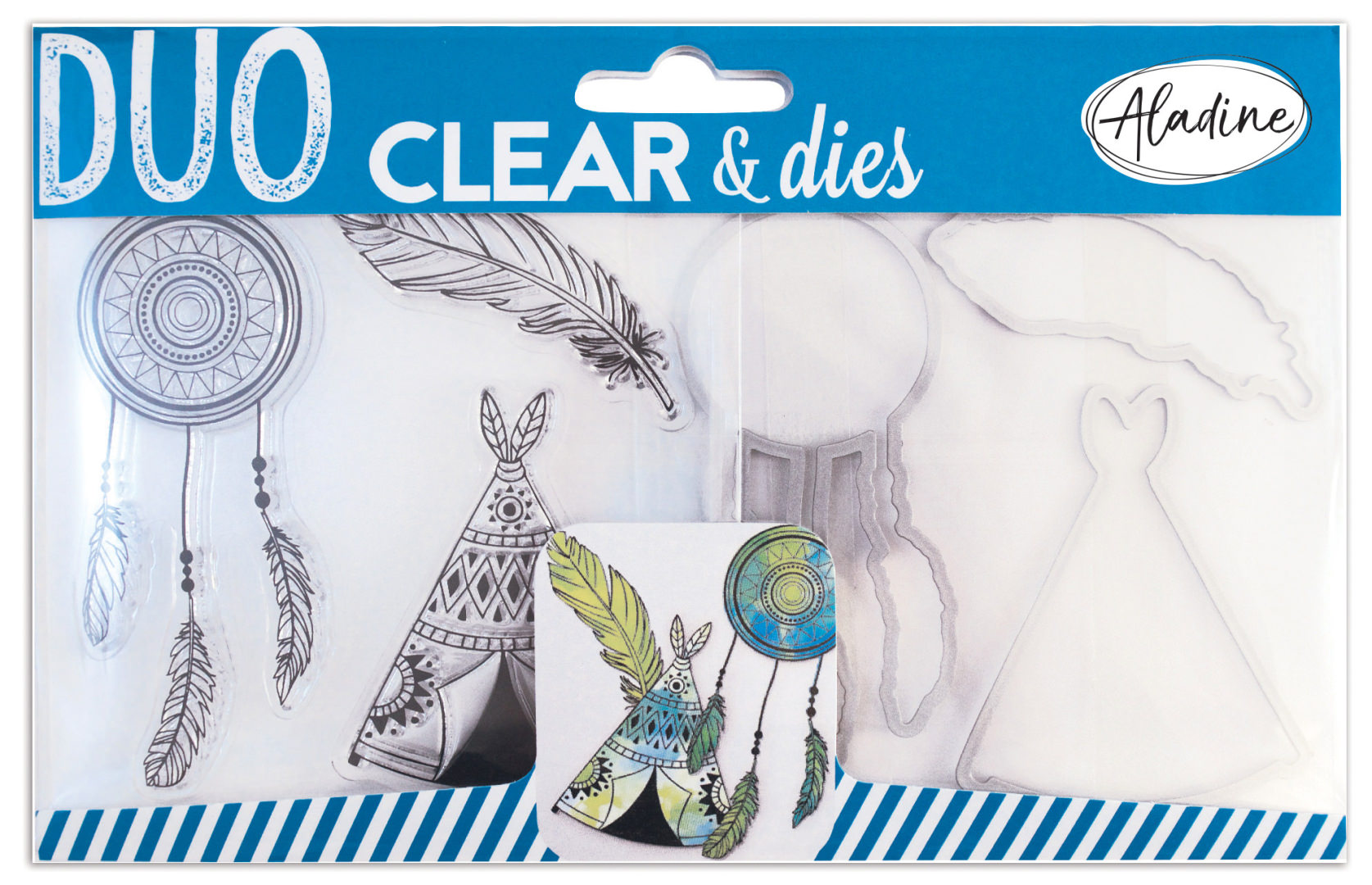 Ce lot contient 3 tampons Clear et 3 matrices Dies attrape-rêves, plume et tipi