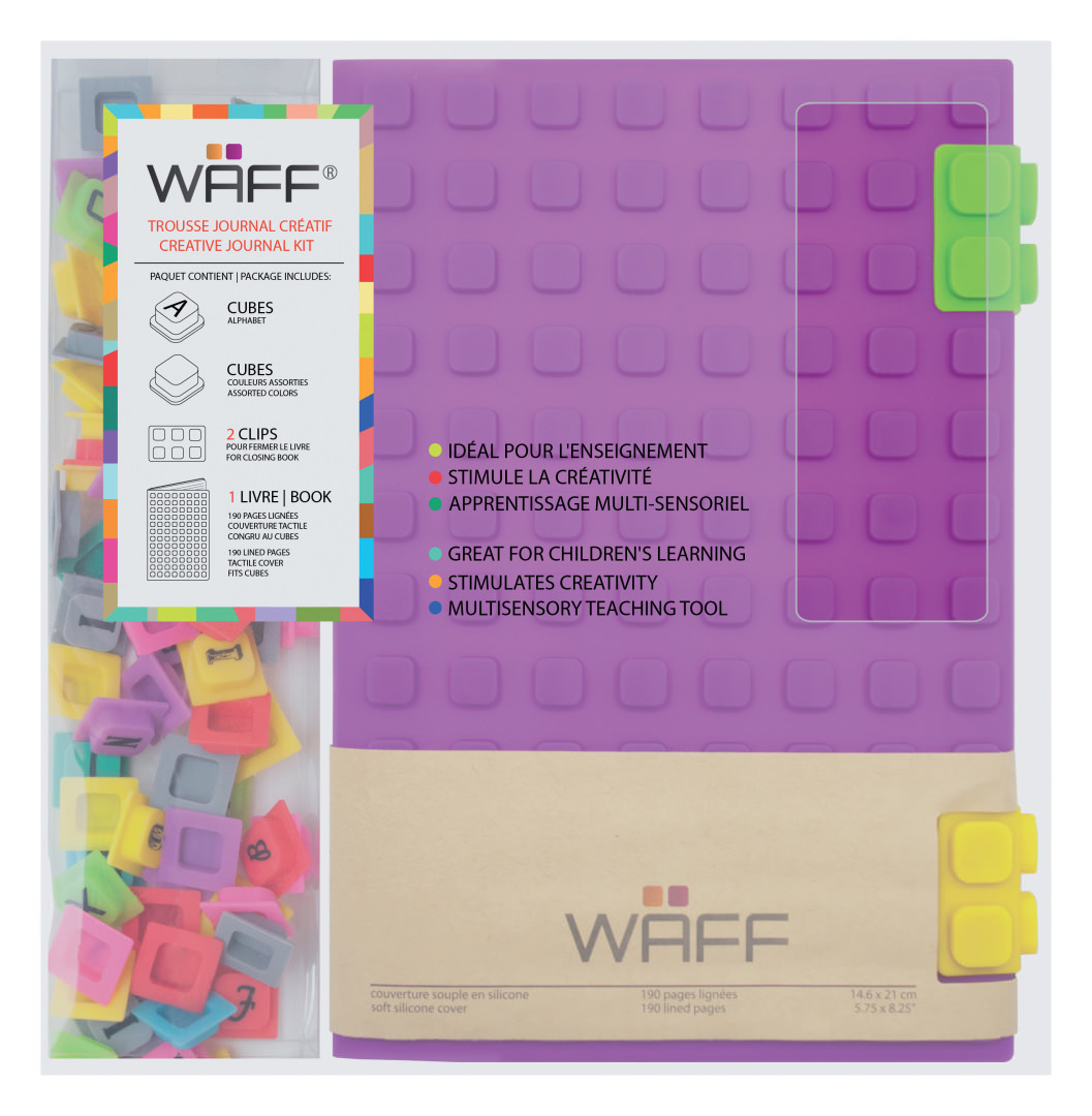 Journal créatif. Idéal pour stimuler la créativité. Couverture souple et personnalisable avec des cubes lettres et motifs WAFF. Journal idéal pour l'enseignement et l'apprentissage multi-sensoriel