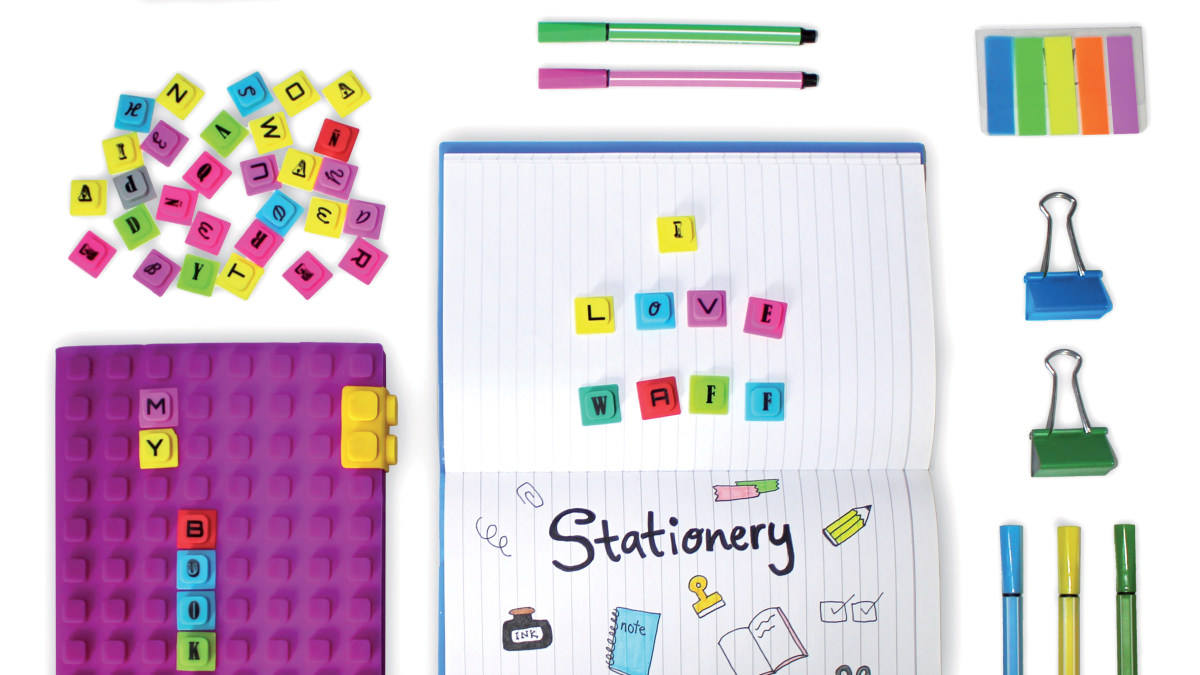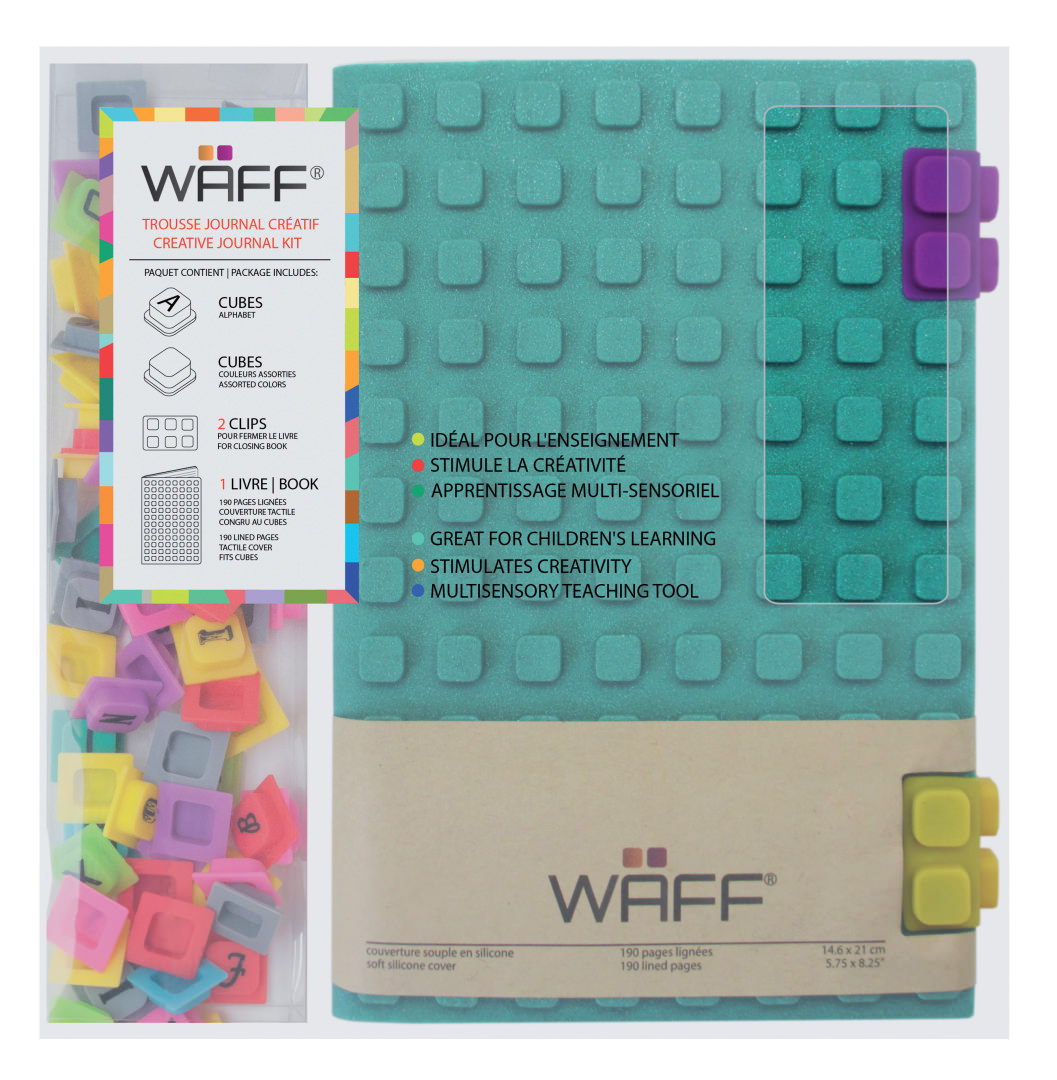 Journal créatif. Idéal pour stimuler la créativité. Couverture souple et personnalisable avec des cubes lettres et motifs WAFF. Journal idéal pour l'enseignement et l'apprentissage multi-sensoriel