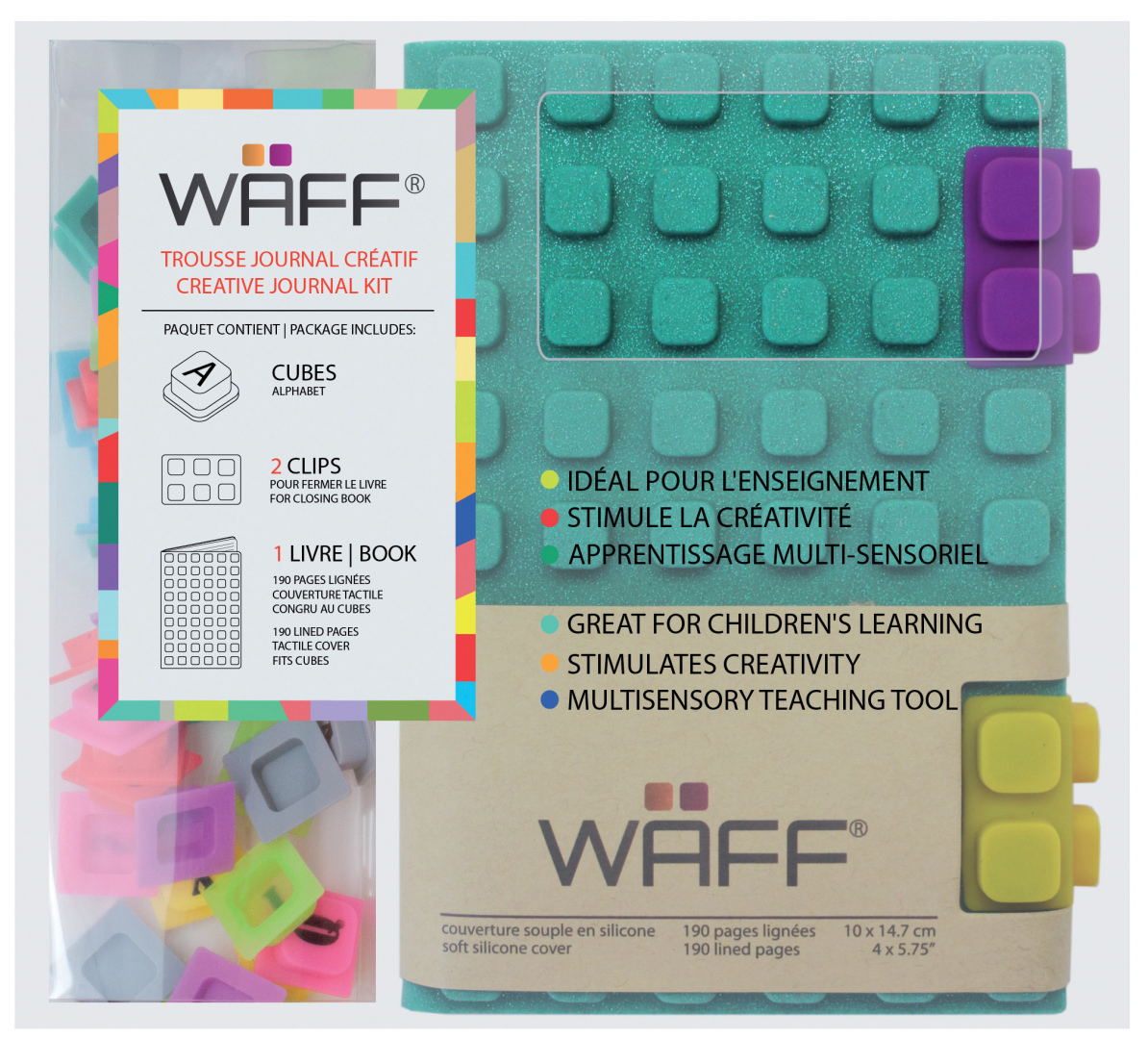 Journal créatif. Idéal pour stimuler la créativité. Couverture souple et personnalisable avec des cubes lettres et motifs WAFF. Journal idéal pour l'enseignement et l'apprentissage multi-sensoriel
